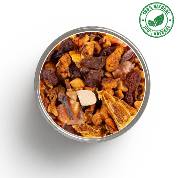 Raisin (raisin, huile végétale), pomme, ananas (ananas, sucre), papaye (papaye, sucre), arôme naturel, écorces de citron, tranches d'orange, AMANDE, clou de girofle, baie de goji, vanille.